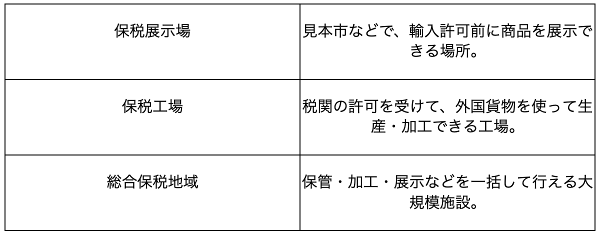 簡単に言うと、「まだ税金(関税・消費税)を払っていない状態で貨物を置いておける地域(エリア)」のことです。